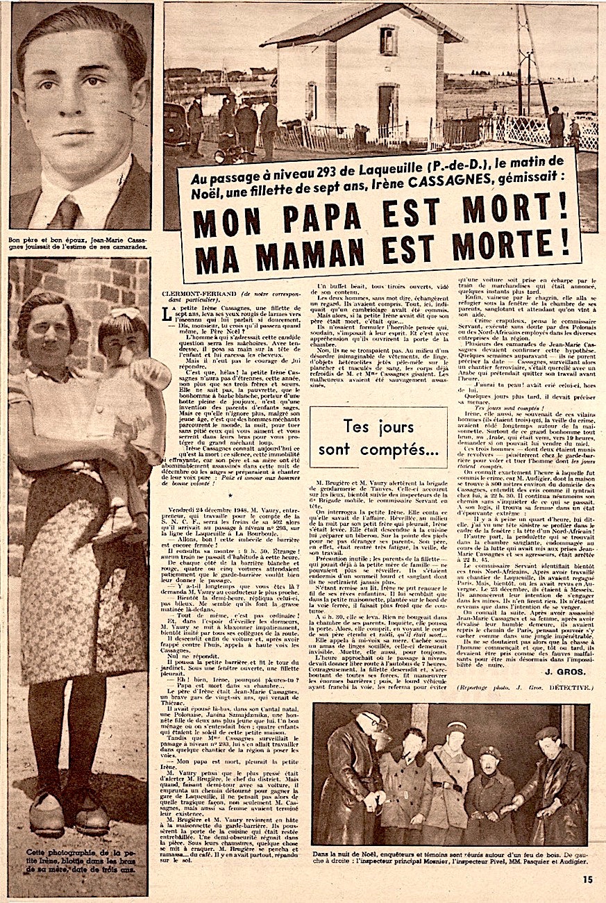 Le matin du vendredi 24 décembre 1948, sa voiture bloquée sur la route 82 par la barrière du passage à niveau n°293 de La Cluze, Aubert VAURY, entrepreneur de la SNCF à La Bourboule, pénétrait dans la maisonnette du garde-barrière et découvrait quatre jeunes enfants en pleurs ainsi que les corps sans vie et ensanglantés de leurs parents, Jean-Marie CASSAGNE et son épouse Janina SZMAJDZIŃSKA, âgés respectivement de 26 et 28 ans, et installés sur la commune de Saint-Sauves depuis trois mois.
