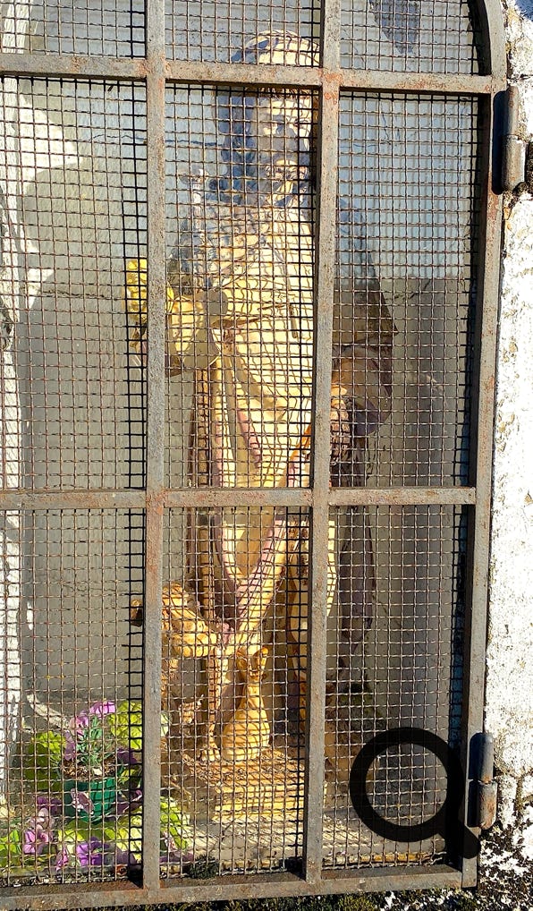 Dans l’iconographie, saint Roch est très souvent représenté en compagnie de son chien accroupi à ses côtés. Il montre avec son doigt le bubon de peste apparu sur son genou ou sur sa cuisse.