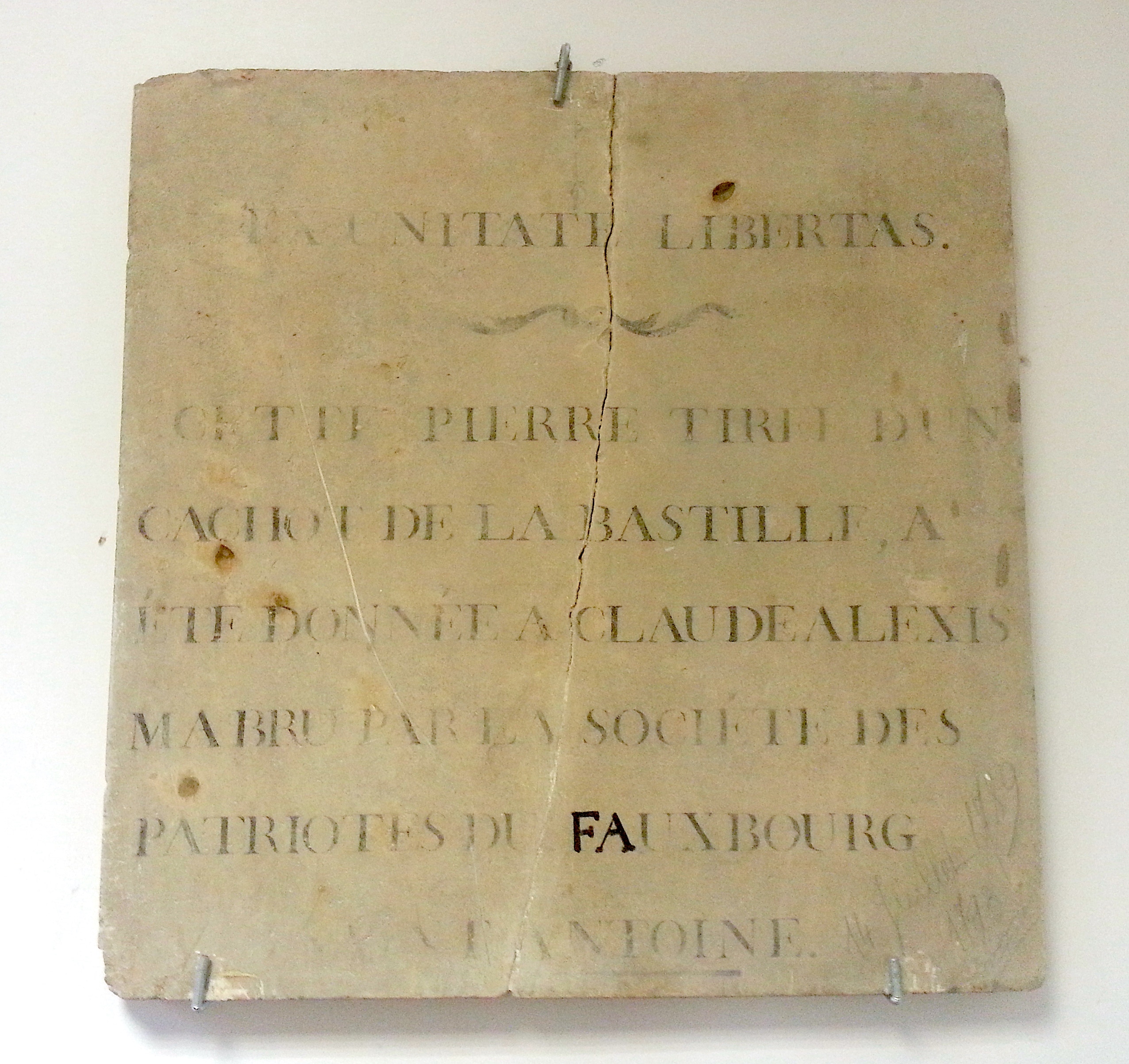La pierre de Saint-Sauves (photo ci-dessous) porte les inscriptions suivantes : «Ex unitate Libertas. Cette pierre tirée d’un cachot de la Bastille a été donnée à Claude Alexis MABRU par la Société des Patriotes du Fauxbourg Saint-Antoine».