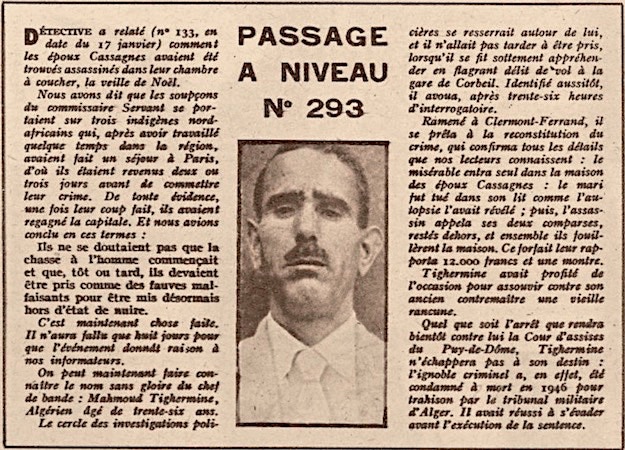 Les enquêteurs du service régional de police judiciaire de Clermont-Ferrand, arrivés sur les lieux dans l’après-midi du 24 décembre et dirigés par le commissaire de police Albert SERVANT, écartaient rapidement le drame familial ainsi que le mobile du cambriolage, estimant le pillage de la maison comme étant une mise en scène, et privilégiaient la thèse d'une vengeance à l'écart du couple. Les soupçons de la police judiciaire s’orientèrent vers trois ouvriers algériens dont Jean-Marie CASSAGNE avait été leur chef de chantier. Au cours d'une altercation quelques semaines auparavant sur un chantier de réfection de la voie ferrée, il avait été menacé de mort par l'un d'entre eux. Ce dernier, Mahmoud TIGHERMINE, marié, sans enfants, manoeuvre âgé de 36 ans et originaire de la région de Constantine, était arrêté dans la nuit du 13 au 14 janvier 1949 lors d'un vol dans un wagon stationné en gare de triage de Villeneuve-Saint-Georges (94).