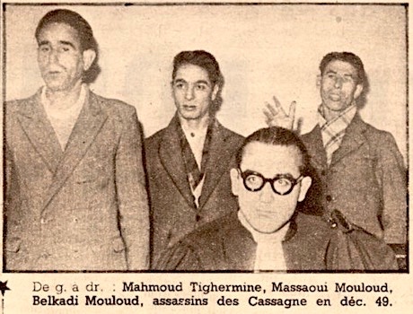 Défendu par Me Raymond BONIEUX, avocat au barreau de Riom, TIGHERMINE avait par le passé déjà été condamné à mort par contumace par le tribunal militaire d'Oran le 23 juillet 1946 pour trahison suite à son engagement sous l’occupation dans la légion des volontaires français contre le bolchevisme ; il avait réussi à s'évader et à gagner la France métropolitaine. MOUSSAOUI était défendu par l’une des premières femmes avocats en France, et alors doyenne des avocats dans l’ordre d’inscription du barreau de Paris, Me Agathe DYVRANDE-THEVENIN, et BELKADI par Me Jean ANDRIEUX, avocat au barreau de Clermont-Ferrand. Etaient cités à la barre le commissaire de police Albert SERVANT, le médecin légiste, le docteur Jean MONGHAL, les témoins Gabriel PASQUIER (chef de canton SNCF), Pierre BRUGUIERE (chef de district SNCF), Fernand AUDIGIER (cultivateur au Petit Planchat), Germaine GOUBETERGUE (garde-barrière à Saint-Julien-Puy-Lavèze), Augustine MIRAND (garde-barrière à Volvic), Jean AUDIGIER (employé SNCF) et Seddik MOUSSAOUI (frère de Mouloud MOUSSAOUI).
