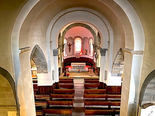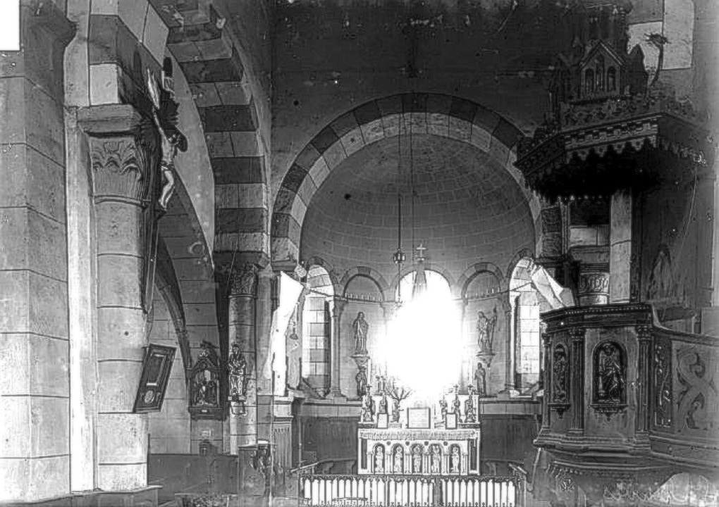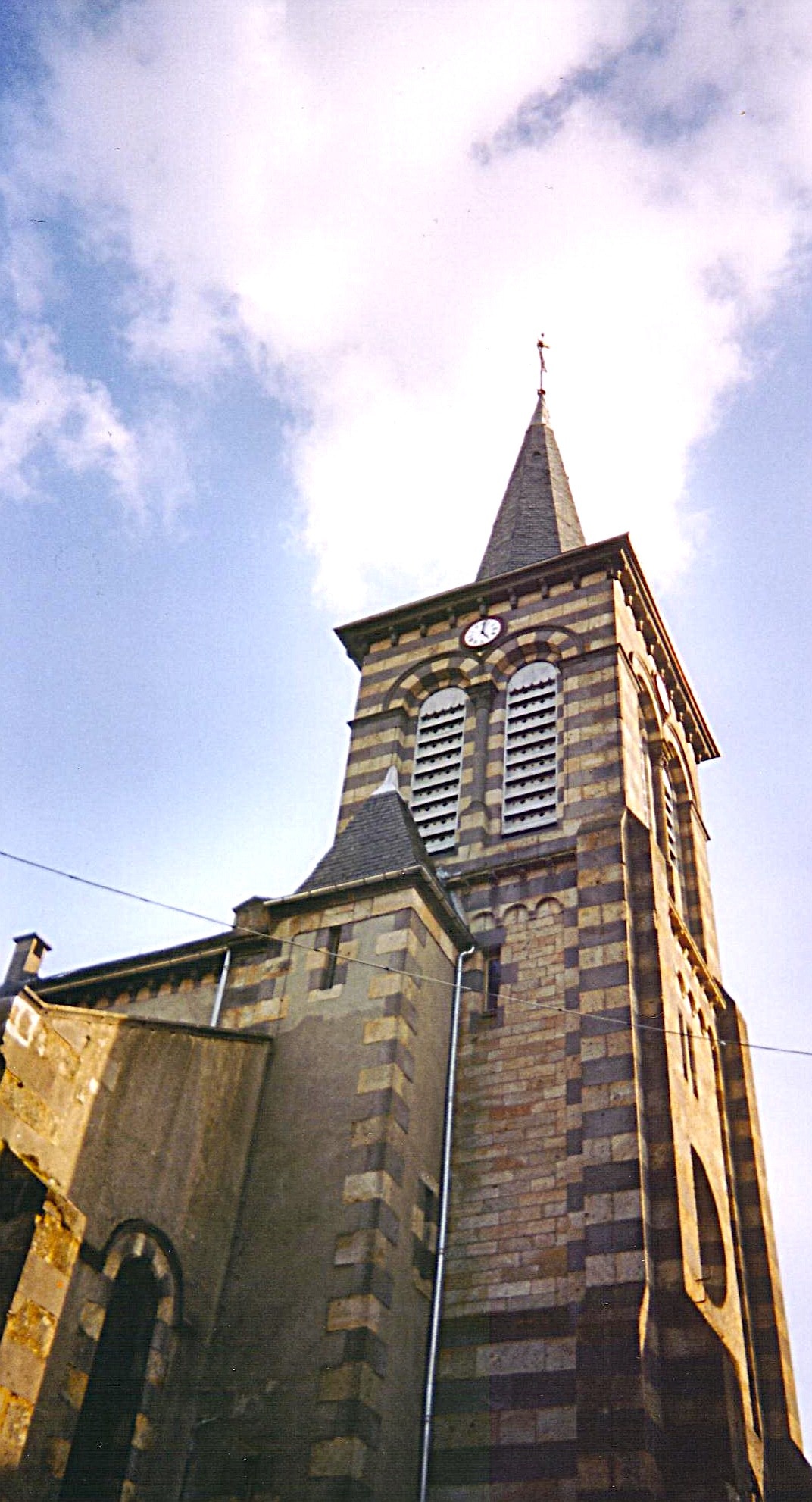 L’église d'origine romane fut reconstruite à neuve de 1872 à 1876 suite à la décision du conseil municipal de remanier le bâtiment. Sa partie la plus ancienne, l’abside circulaire avec sa voûte en cul-de-four, date des XIème et XIIème siècles (les chapiteaux avec entrelacs d'inspiration carolingienne seraient du dernier quart du XIème siècle ; ceux de la nef paraissent légèrement plus tardifs comme étant du XIIème siècle). Les bas-côtés et les clés de voûte des nefs latérales sont du XVIème siècle et sont ornées du blason à trois chevrons de la famille de LEVIS ; à noter le bas-relief (vestige d'un linteau ?) enchâssé dans le mur extérieur orienté nord-est de l'église représentant un griffon et un lion, ainsi que les armoiries scellées sur l'un des piliers centraux de la nef.
