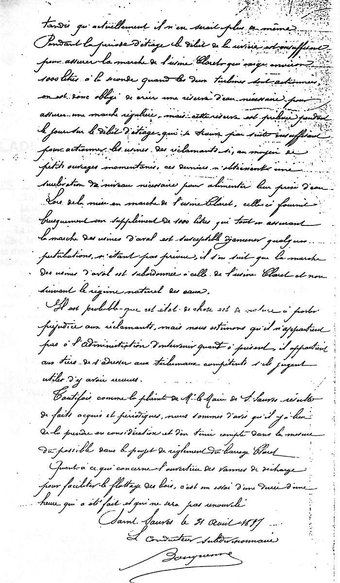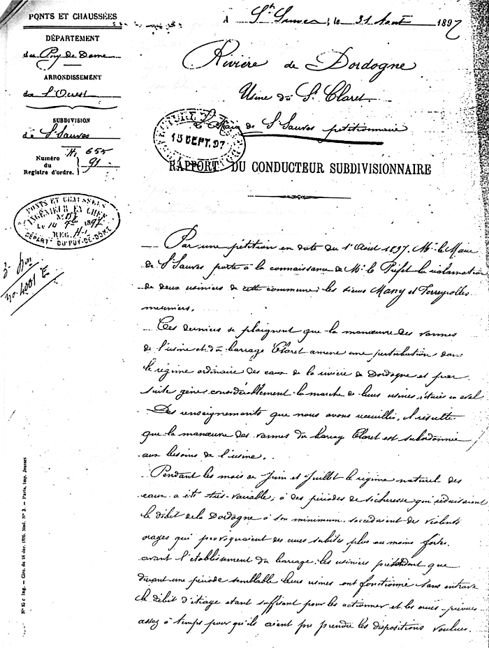 18 avril 1908 - M. BARBAT de La Tour présente au conseil municipal de Saint-Sauves un projet consistant à exploiter la chute sur la Dordogne en amont du Pont et à construire à proximité une usine. Le projet permettant de "rendre des avantages très importants à la commune en fournissant la lumière électrique" est accepté. Le prix des abonnements sera revu tous les dix ans. Une concession de 32 ans est accordée ainsi qu'un délai de 6 mois pour commencer les travaux. La lumière devra être fournie à partir du 1er septembre 1909.