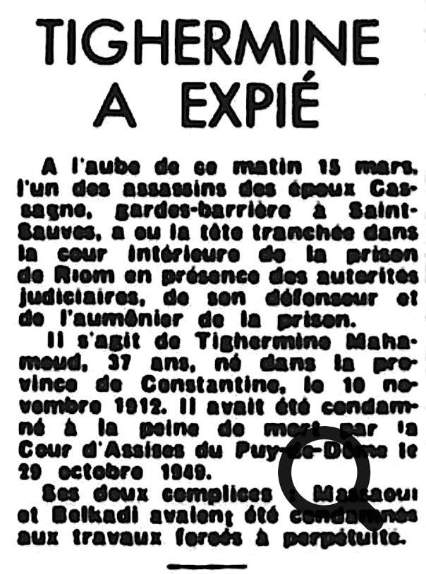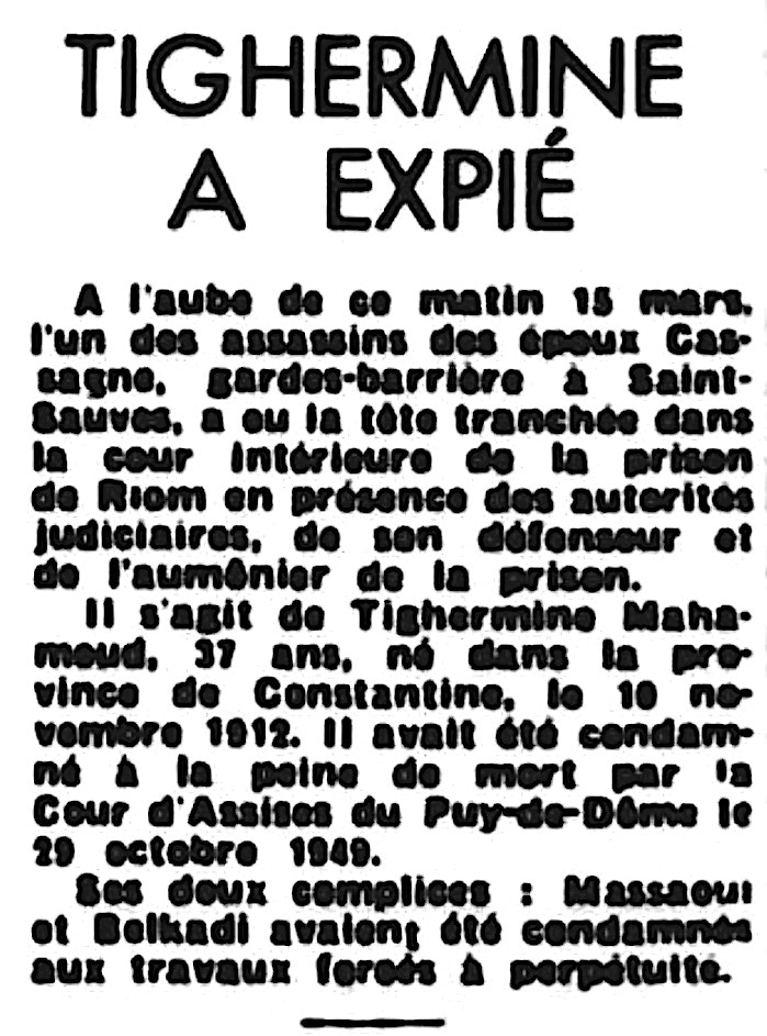 Le samedi 29 octobre dans la soirée, la Cour d'assises condamnait à la majorité absolue TIGHERMINE à la peine de mort pour assassinats et vol qualifié ; celui-ci s’évanouissait à l'énoncé du verdict. Le jury ayant admis des circonstances atténuantes à leur égard, ses deux complices étaient condamnés à la peine des travaux forcés à perpétuité malgré les réquisitions de l’avocat général en faveur de trois exécutions capitales. Leur pourvoi ayant été rejeté par la chambre criminelle de la Cour de Cassation le 14 décembre 1949, TIGHERMINE était guillotiné dans la cour de la maison d'arrêt de Riom le 15 mars 1950 à 06 heures 35. Il s'agissait de la 163ème exécution capitale de l'exécuteur en chef des arrêts criminels de France Jules Henri DESFOURNEAUX (1877-1951) et TIGHERMINE était le dernier condamné à mort exécuté en Auvergne. Dix ans plus tard, la peine de BELKADI, alors détenu à la maison centrale de Nîmes, était commuée à vingt ans de travaux forcés.