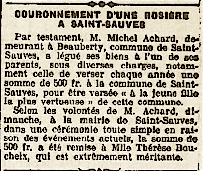 Le couronnement annuel de la Rosière de Saint-Sauves a pour origine la volonté d’un habitant, propriétaire cultivateur du village de Beauberty, décédé le 21 avril 1910 à l'âge de 65 ans sans postérité. Fils de Michel et Sébastienne ACHARD né le 5 novembre 1844 à Saint-Sauves, Michel ACHARD laissa un legs de 850 louis d'or (17 000 francs) destiné à être versé par l'État selon les conditions de son testament olographe en date du 6 août 1906 : « Article trois - je donne et lègue à la fille qui pourrait mériter le titre de «Rosière », par sa conduite, la somme de cinq cents francs, tous les ans, établie sur le modèle de la Rosière de Montferrand ». Couronnée le 21 novembre 1914 dans la salle de la mairie par l'édile de l'époque, Jean PERRY, Marie-Thérèse Légère Antoinette BOUCHET, du bourg, en fut la première bénéficiaire (En 1914-1918 et 1939-1945, la Rosière est désignée dans une certaine confidentialité, sans faire l'objet de festivités).