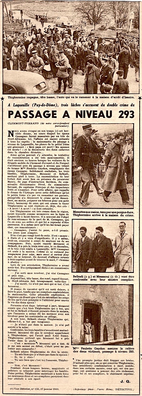 La reconstitution judiciaire du double assassinat se déroulait à La Cluze au cours de la matinée du 5 avril 1949 ; en présence de plus de 300 spectateurs, TIGHERMINE accusait MOUSSAOUI du crime tandis qu'il serait resté dehors à faire le guet, version contestée par ses complices. Les trois suspects étaient mis en accusation et renvoyés devant la Cour d'assises du Puy-de-Dôme par un arrêt rendu le 31 mai 1949.