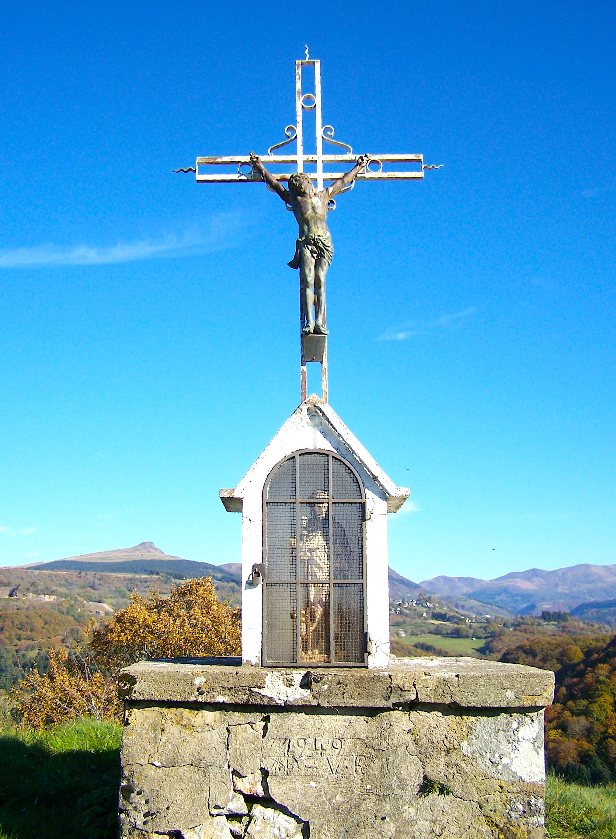 Cette pierre fut rapportée par deux hommes dont les familles étaient originaires de Lavaux et de Beauberty, villages de Saint-Sauves; l’un d’eux, Claude-Alexis MABRU, né le 2 décembre 1755 à Clermont-Ferrand, fils du conseiller d'Etat du Roi et receveur général des consignations de Clermont-Ferrand Claude MABRU (né le 22 novembre 1725 à Saint-Sauves de Michel et de Marie GUILLAUME) et de Marie BLANCHON était lui même "conseiller du Roi, receveur général des consignations en Cour de Clermont-Ferrand, trésorier de France du bureau des finances de la Généralité de Riom, chevalier seigneur de la Jarrige, Rusolles, Chasternac, Saint-Bonnel, grand voyer de la Généralité de Riom et Province d'Auvergne, juge directeur des domaines de Sa Majesté, chevalier de l'ordre du Roi". Cette personnalité est un descendant d'une grande famille de bourgeois et de notaires royaux de Saint-Sauves. Un aïeul notaire, Pierre MABRU, lui-même frère de Marie GUILLAUME et arrière-petit-fils de Louis MABRU et de Jeanne d'ESTAING, devint bailli de la seigneurie de Granges et Tauves au cours de la seconde moitié du XVIIème siècle. Quant au frère cadet de Claude-Alexis, Joseph-Antoine MABRU (1714-1790), il resta notaire et procureur à Saint-Sauves de 1750 à 1790 avant que son fils aîné Michel-Marie ne reprenne l'office de 1800 à 1817.