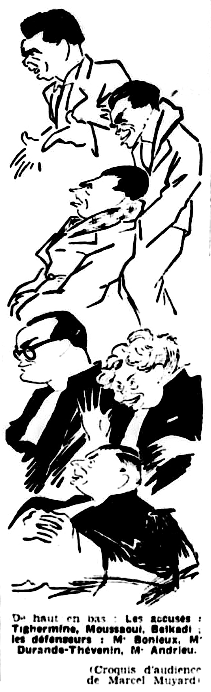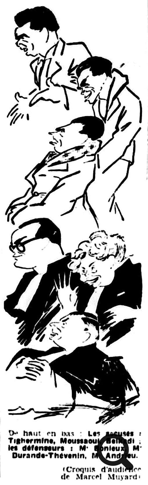 Défendu par Me Raymond BONIEUX, avocat au barreau de Riom, TIGHERMINE avait par le passé déjà été condamné à mort par contumace par le tribunal militaire d'Oran le 23 juillet 1946 pour trahison suite à son engagement sous l’occupation dans la légion des volontaires français contre le bolchevisme ; il avait réussi à s'évader et à gagner la France métropolitaine. MOUSSAOUI était défendu par l’une des premières femmes avocats en France, et alors doyenne des avocats dans l’ordre d’inscription du barreau de Paris, Me Agathe DYVRANDE-THEVENIN, et BELKADI par Me Jean ANDRIEUX, avocat au barreau de Clermont-Ferrand. Etaient cités à la barre le commissaire de police Albert SERVANT, le médecin légiste, le docteur Jean MONGHAL, les témoins Gabriel PASQUIER (chef de canton SNCF), Pierre BRUGUIERE (chef de district SNCF), Fernand AUDIGIER (cultivateur au Petit Planchat), Germaine GOUBETERGUE (garde-barrière à Saint-Julien-Puy-Lavèze), Augustine MIRAND (garde-barrière à Volvic), Jean AUDIGIER (employé SNCF) et Seddik MOUSSAOUI (frère de Mouloud MOUSSAOUI).