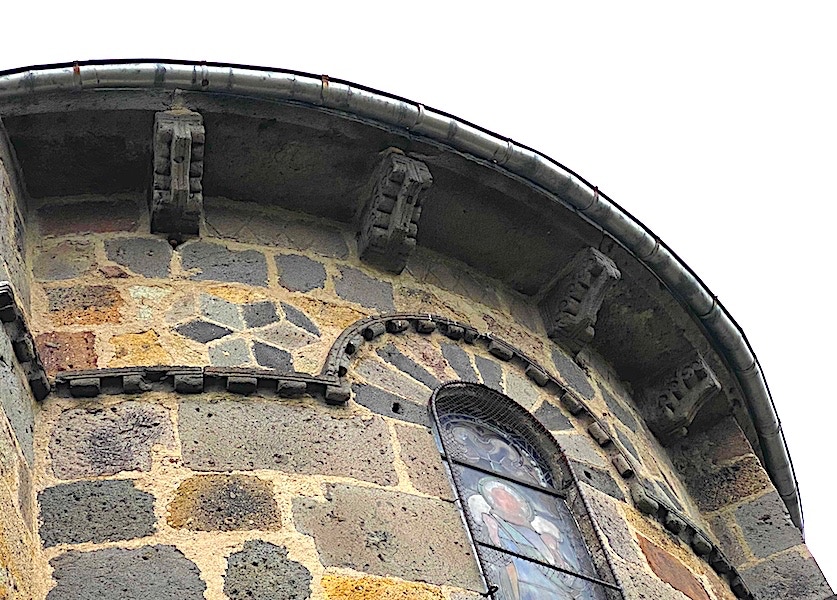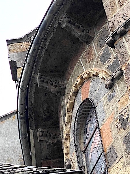 La voûte est en berceau plein cintre sur les deux premières travées de la nef, en voûte d'ogive sur les bas-côtés, en voûte à berceau plein cintre en brique sur la dernière travée et en voûte d'arrête en brique sur la dernière travée des bas-côtés. Les chaînages du clocher, les contreforts de la nef et des sacristies utilisent des pierres volcaniques bicolores (andésite et ignimbrite). Les matériaux employés sont ainsi la pierre de taille (moyen appareil), le moellon et l'enduit ; la couverture est en ardoise. Le plan est allongé à un vaisseau avec un toit à long pan, en appentis et en pavillon (croupe ronde ; escalier en vis sans jour). Certains vitraux, dons de paroissiennes (Jeanne BOUCHAUDY née MANRY -de Liournat-, Céline et Marie MANRY, Antoinette RAMADE), sont datés de 1969.