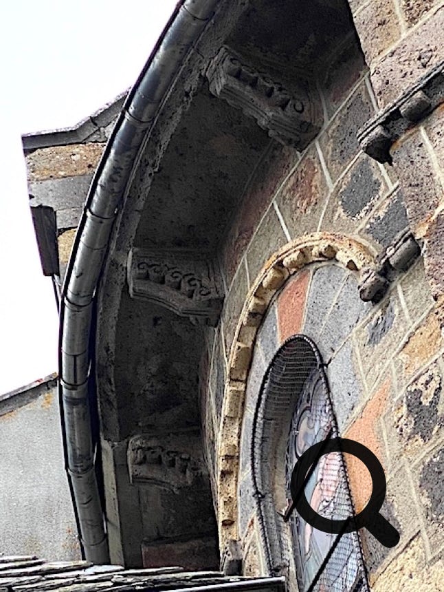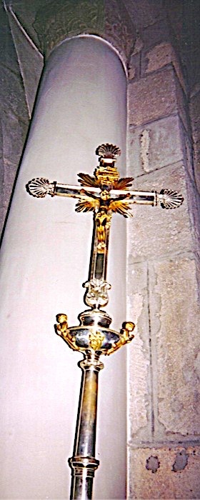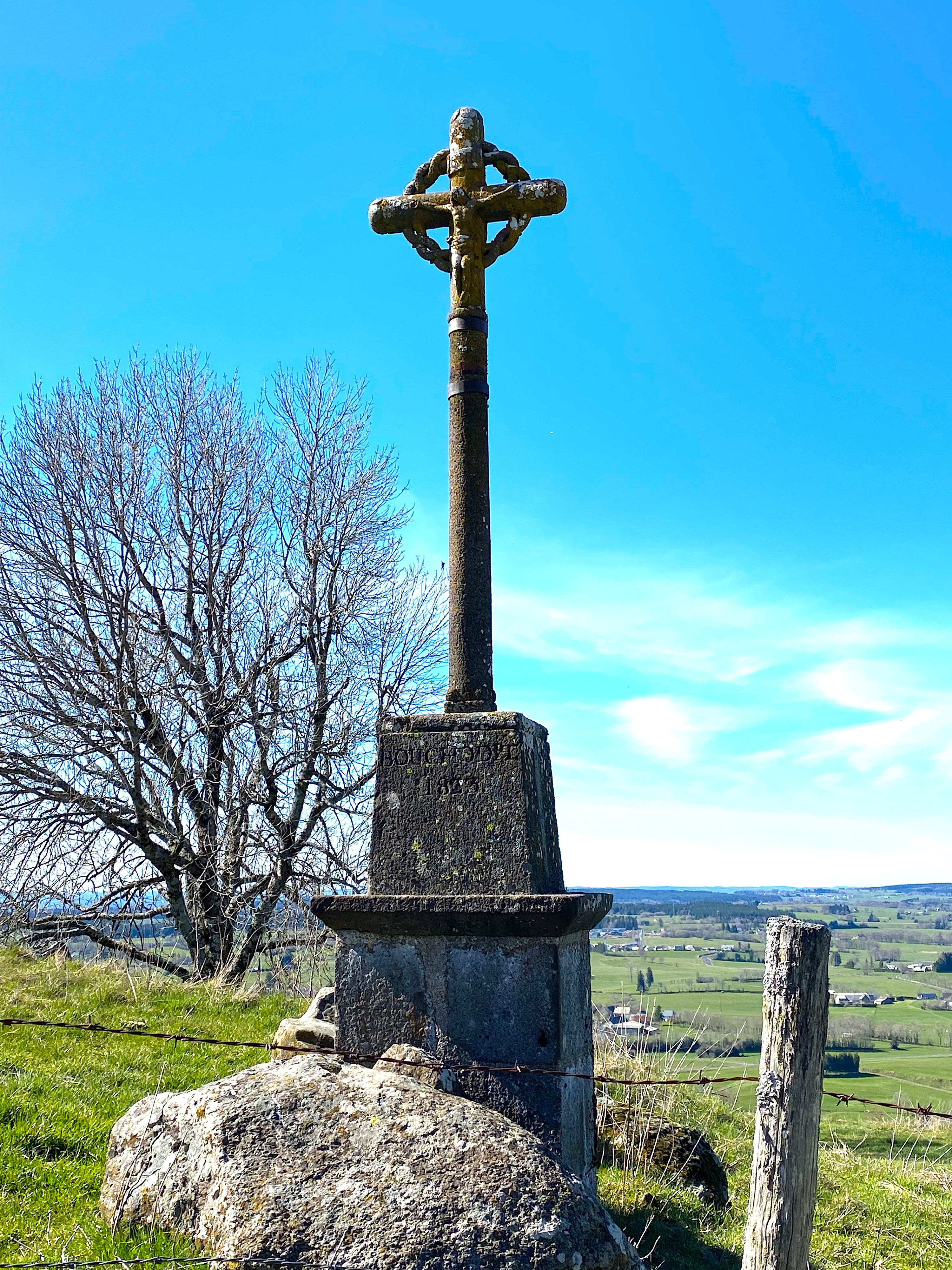 À noter la croix en fer du cimetière du XVIIIème siècle (photo ci-dessous à gauche) ; il s'agit d'une croix ostensoir, aux fers plats et à l'amortissement en fer de lance baguée. Le centre du croisillon est occupé par un Christ de petite taille de bronze, surmonté du titulus. La hampe est bordée d'une crête à éléments spiralés, comme la croix très semblable d'Orcival (au nord de la basilique), vraisemblablement oeuvres du même auteur. On dénombre 41 croix monumentales sur l'étendue de la commune de Saint-Sauves, dont la plus ancienne, d'après l'inscription sur son socle (1823), se trouverait dans le village de Lestomble (photo ci-dessous à droite).