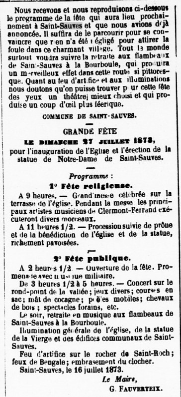 Une statue de Notre-Dame de Saint-Sauves a été inaugurée par l'abbé Louis Antoine CHAIX, curé de Saint Genès les Carmes, et bénie par le père MAUBERT, curé de Tauves, le 27 juillet 1873, avec l'église rénovée. Cette Vierge immaculée surplombe le pignon découvert de la nef.