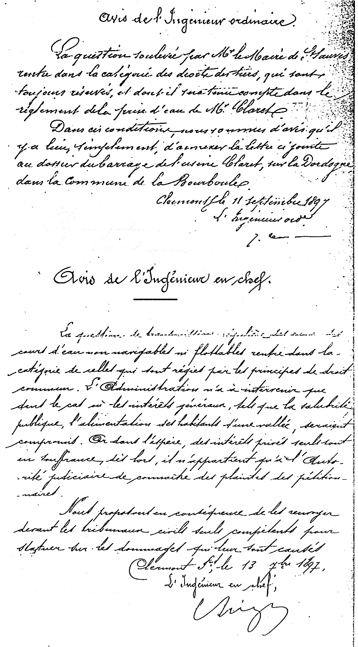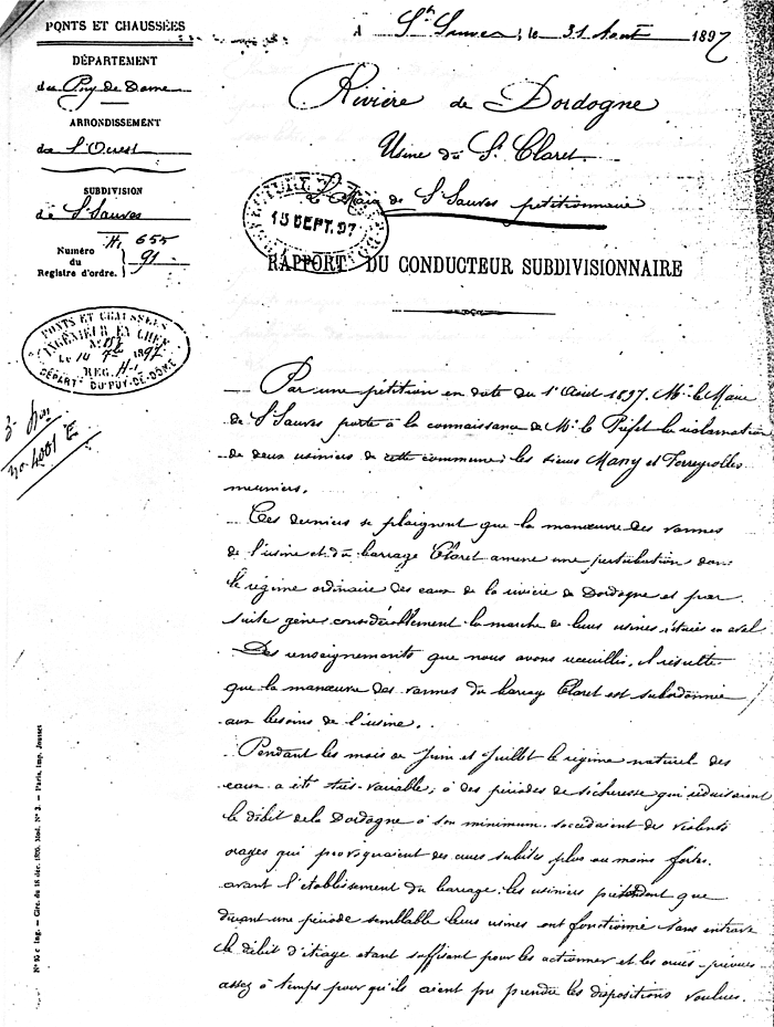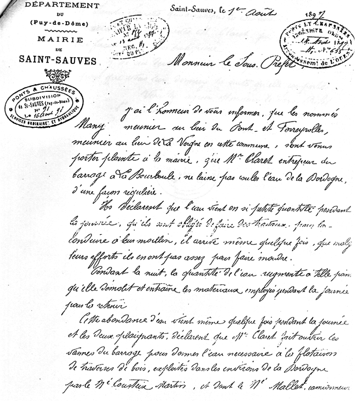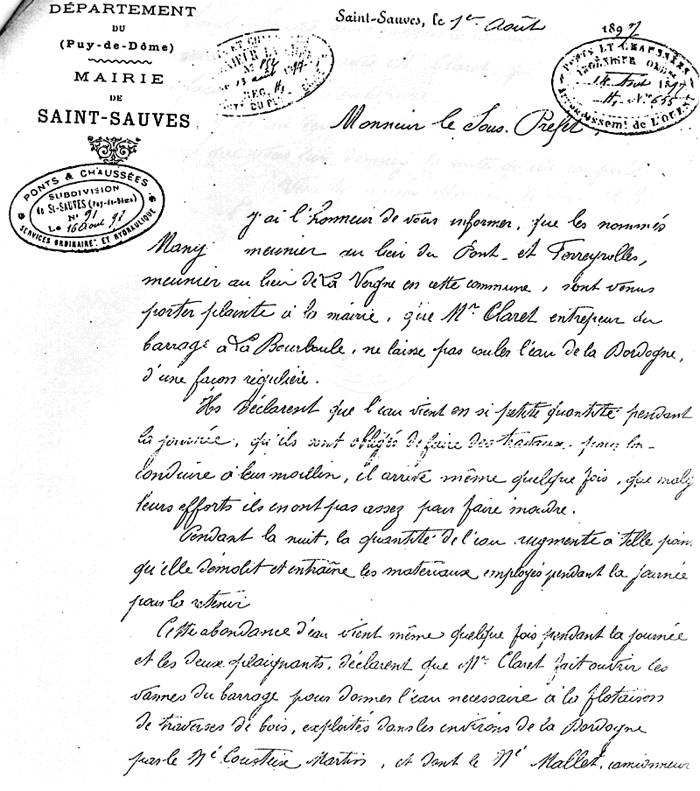18 avril 1908 - M. BARBAT de La Tour présente au conseil municipal de Saint-Sauves un projet consistant à exploiter la chute sur la Dordogne en amont du Pont et à construire à proximité une usine. Le projet permettant de "rendre des avantages très importants à la commune en fournissant la lumière électrique" est accepté. Le prix des abonnements sera revu tous les dix ans. Une concession de 32 ans est accordée ainsi qu'un délai de 6 mois pour commencer les travaux. La lumière devra être fournie à partir du 1er septembre 1909.